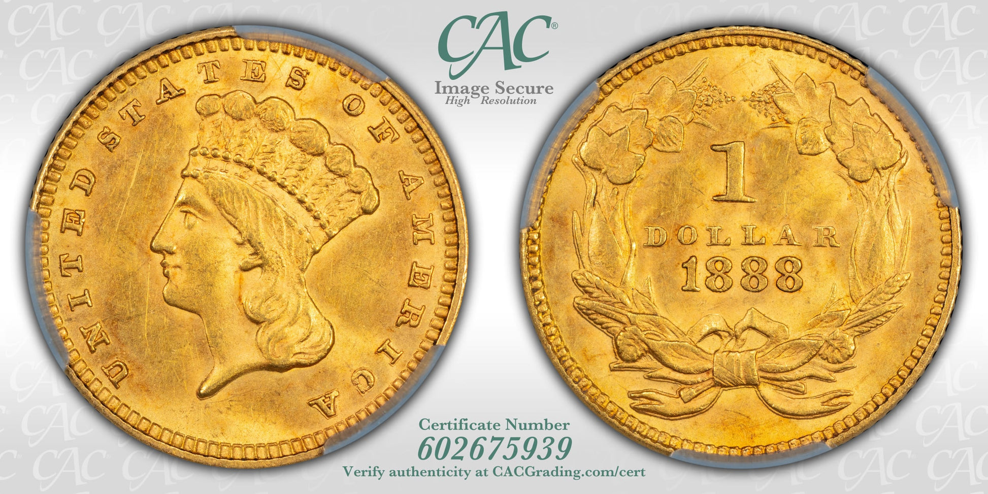 1888 Type 3 Indian Princess Large Head Gold Dollar CAC CACG MS63 Superb Strike